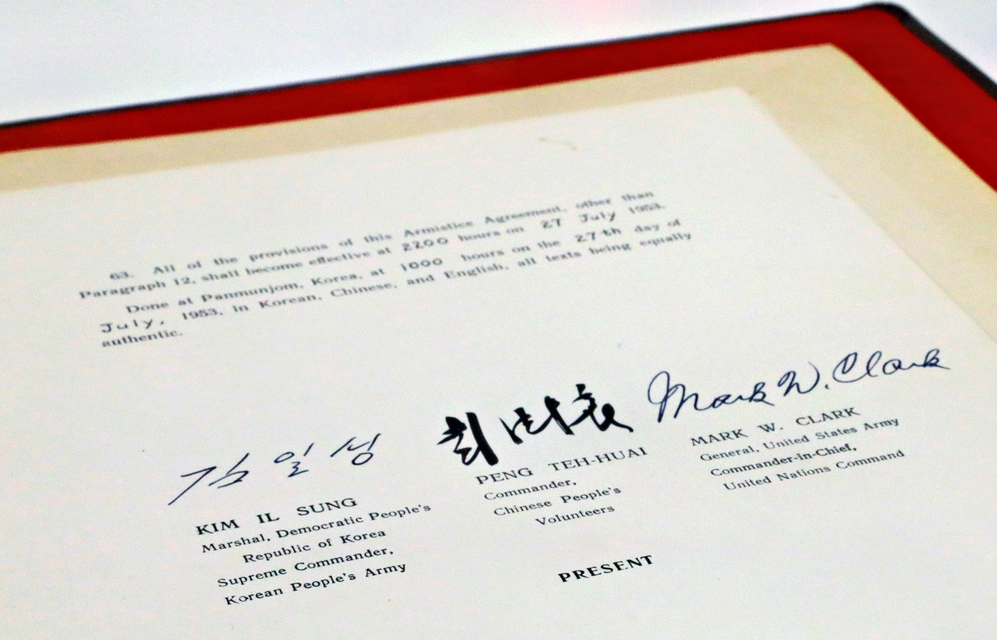 Photo at top: The signatures of North Korea’s Supreme Army Commander and Leader Kim Il Sung, grandfather of current North Korean Leader Kim Jong-un, along with signatories from China and the United Nations (led by the U.S.), are seen on the original English-language copy of the Armistice Agreement that ended the Korean War, signed on July 27, 1953, as displayed in a conservation lab of the U.S. National Archives in Adelphi, Maryland.