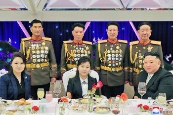 I was interviewed early this morning, along with Dr. Go Myong-hyun of The Asan Institute, on the new Arirang News current affairs program, “Within the Frame,” just prior to the commencement of the military parade marking the 75th anniversary of North Korea’s military. It was also the day after Kim Jong Un and his wife, Ri Sol-ju, were seen at a dinner banquet for military leaders with their daughter, Ju-ae (see above photo). The military parade began about 90 minutes after this live broadcast concluded. Many thanks to host Kim Bo-kyoung for her questions.